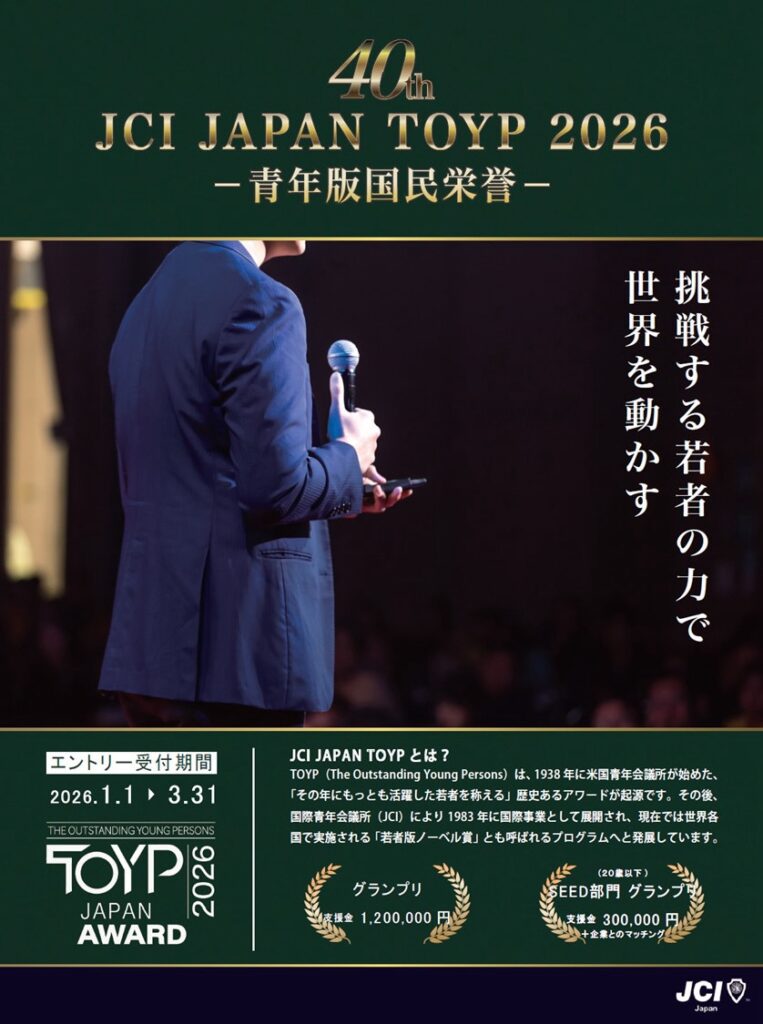TOYP(The Outstanding Young Persons=傑出した若者たち)とは、日本のあらゆる分野において、社会に持続的なインパクトを与えることのできる可能性を秘めた「傑出した若者(=すごい若者)」を発掘、発信、支援することを目的とした事業です。